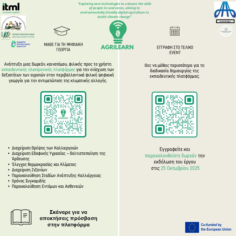 Εκπαιδευτική Πλατφόρμα με στόχο την ενίσχυση των δεξιοτήτων των αγροτών. Η Ερευνητική Μονάδα GIS ΓΠΑ ανέπτυξε μια δωρεάν, καινοτόμα εκπαιδευτική πλατφόρμα στο πλαίσιο του ευρωπαϊκού προγράμματος Agrilearn, με στόχο την ενίσχυση των δεξιοτήτων των αγροτών για μια πιο “πράσινη” γεωργία.Μάθε πώς μπορείς να βελτιστοποιήσεις την καλλιέργειά σου με ψηφιακά εργαλεία ή σκάναρε το qr της εικόναΜάθε περισσότερα για την […]
